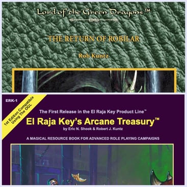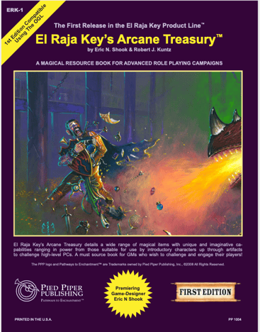 Written by Eric Shook and Rob Kuntz, and originally published [as a print product] in 2008 by Rob's Pied Piper Publishing company as "The First Release in the El Raja Key Product Line", El Raja Key's Arcane Treasury [ERKAT] describes itself as a magical resource book for advanced role playing campaigns. Now available again, this time as a digital reprint, ERKAT is a welcome addition to Rob's iconic digital collection on TLS Store!